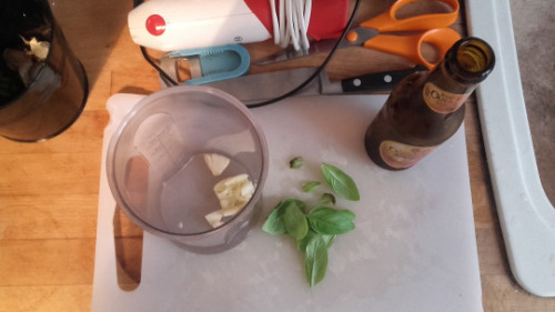 La suite est assez simple. Tu fous tout, l’ail, les courgettes, les noisettes, les feuilles de basilic dans un récipient, avec le parmesan râpé (avec les petits trous de la râpe).