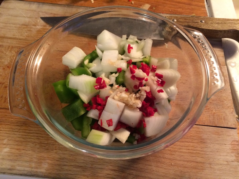 On va faire la farce et le guacamole, ça se fait en même temps.Tu écrases la gousse d’ail. Tu détailles en dès ton poivron, ton oignon, dont tu réserves une tranchouille pour le guacamole que tu vas hacher plus finement. Pareil avec le piment, tu lui enlèves ses pépins, puis tu le coupes en lamelles et tu réserves la pointe que tu vas hacher plus finement pour l’inclure dans le guacamole. À part, tu découpes tes tomates dont tu réserves également une tranche qui ira, en dès plus petit, dans le guacamole. Donc si on résume, en images, on a d’un coté :