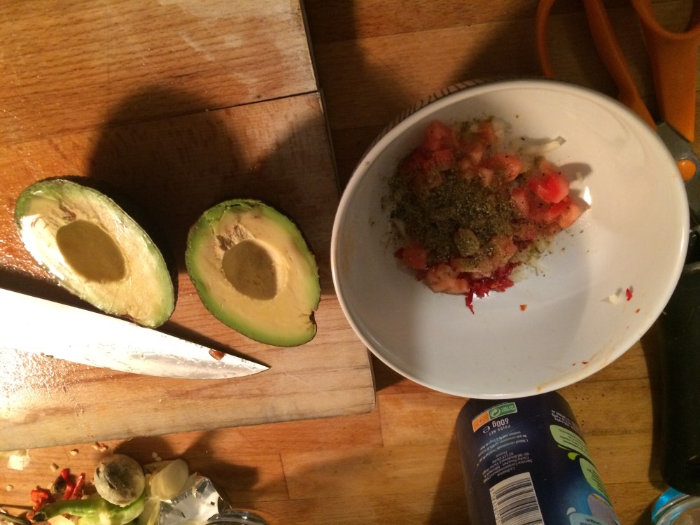 Non, non, t’as pas sauté une étape pour le guacamole, c’est moi qui ai oublié de te dire de verser une généreuse rasade de cumin moulu sur le bordel. Puis tu y fous ton avocat, sel, poivre, et citron pour que le tout ne noircisse pas, et après, c’est toi qui vois. Je trouve les guacamole trop brassés un peu écœurants, alors je l’écrase à la fourchette, c’est plus relou qu’au mixeur, mais je préfère. Après tu fais ce que tu veux, je m’en branle. 3615 ta vie.Tu mets ton guacamole de coté, mais pas au frigo, sinon il aura aucun gout.