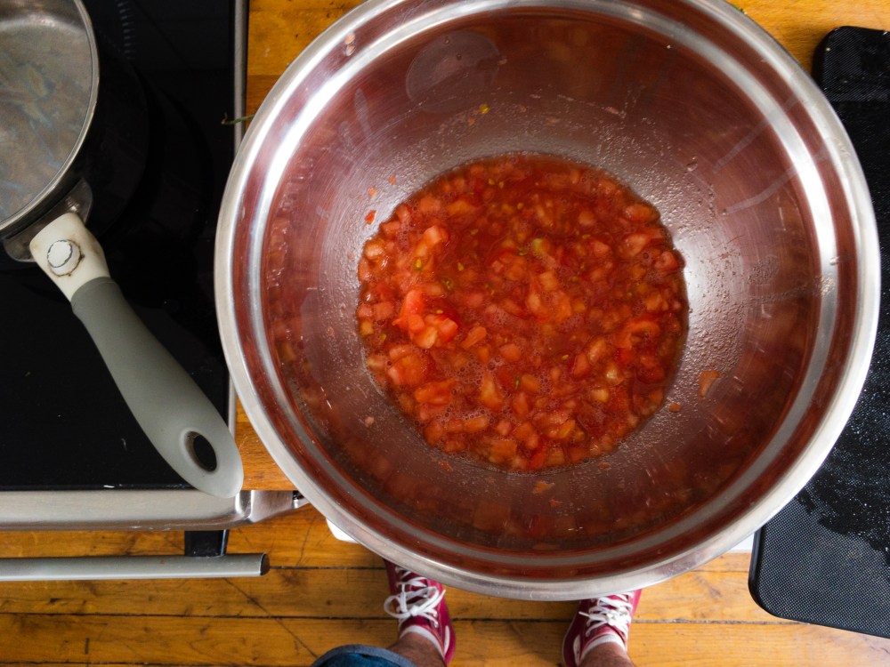 Ensuite, il faut peler les tomates. Pourquoi ? Sérieux on a pas dégagé le persil pour se retrouver avec des vieux bouts de peau collés aux dents. Merde. Pour peler, tu connais la chanson, 50 secondes dans l’eau bouillante et hop, sous l’eau froide et ça se fait tout seul. Une fois pelées, tu en extraies (avec un instrument de type « petite cuillère » ou mieux encore, « cuillère à pamplemousse » si tu en as une. Mais tu n’en as pas, qui a une cuillère à pamplemousse ?) les pépins et la pulpe que tu touilles avec ton fond de sauce et tu découpes la chair en tout petits dès. Tu les verses dans la sauce.