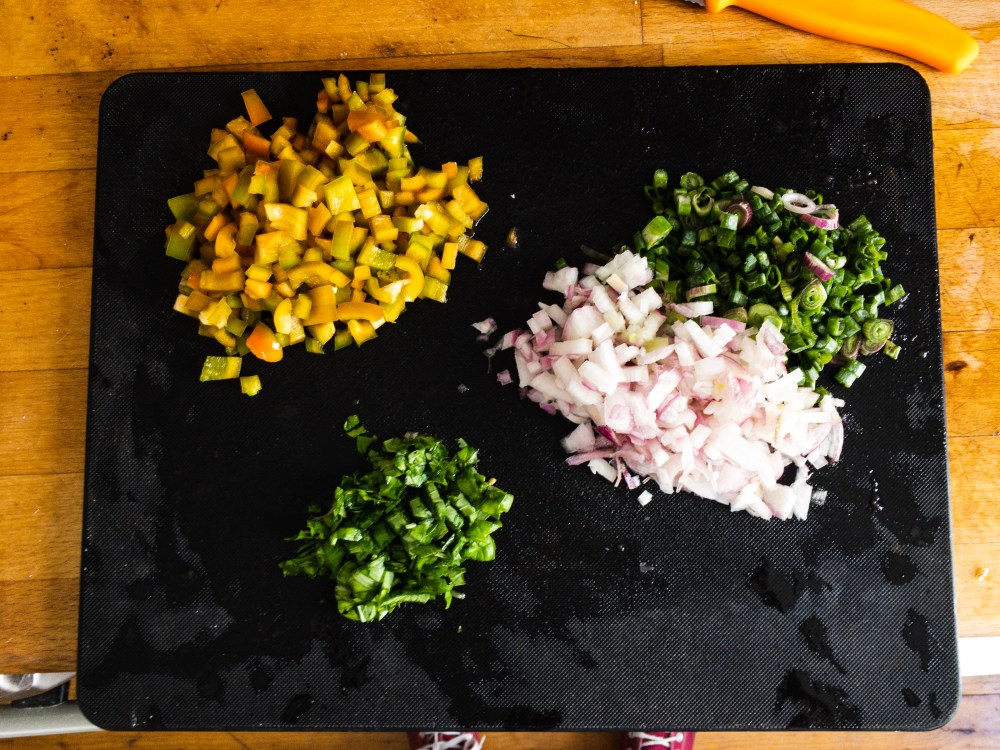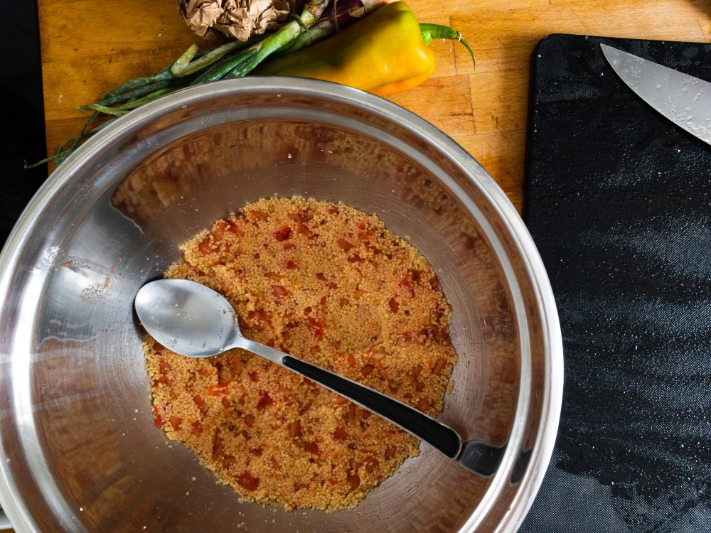 Un dimanche après l’office, le taboulé est fatalement tombé entre les mains de ma mère qui l’a interprété comme une variante du gaspacho ou le pain est remplacé par de la semoule. Ma recette est en gros celle de ma mère : de la semoule qui gonfle à froid dans une vinaigrette et de la tomate, et éventuellement d’autres trucs de saison et les herbes que tu veux. Moi ça dépend de ce que j’ai sous la main. Là, du basilic. Pourquoi se faire chier avec de la menthe et de la coriandre ou je ne sais quoi alors que rien ne va mieux avec la tomate que le basilic ?